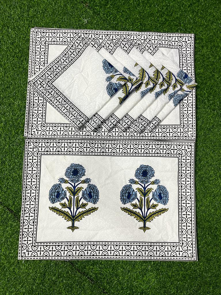 Crafted from 100% cotton, this dining set not only offers a soft and luxurious feel but also ensures durability for repeated use. The handblock printing technique employed in their creation adds an artisanal touch, making each piece a unique expression of craftsmanship and attention to detail.