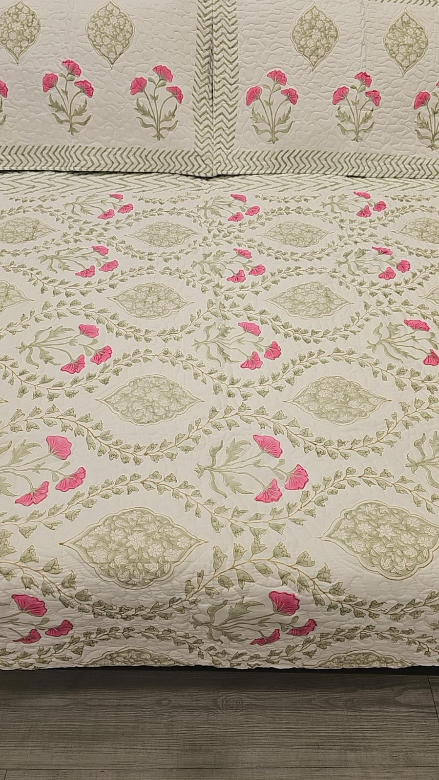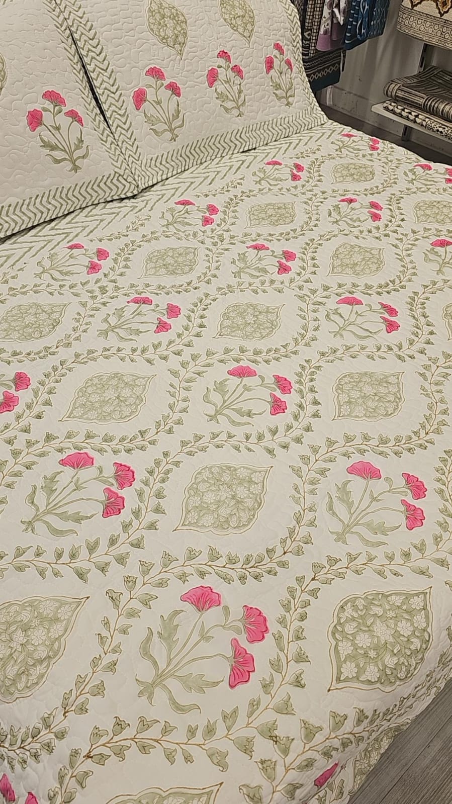 Introducing our "Verdant Blooms: Green Jaal Print Comforter Set" - a stunning combination of style and comfort that will transform your bedroom into a serene oasis. Crafted with exquisite handblock print detailing, each piece in this set is a testament to artistry and elegance.