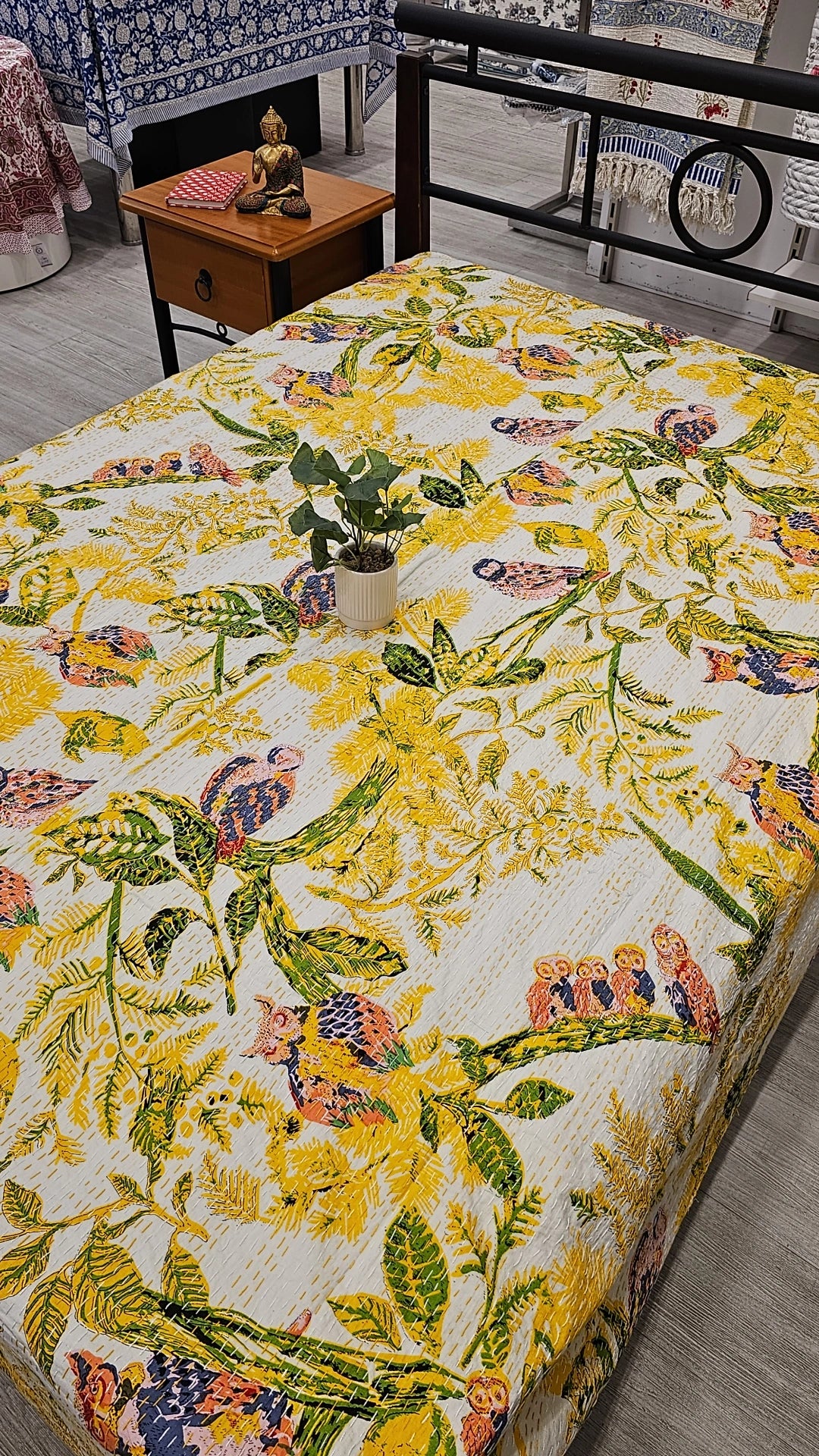 Step into a world of enchantment with our "Whimsical Blooms: Floral Owl Kantha Quilt." This masterpiece seamlessly weaves together the charm of nature's blossoms and the wisdom of owls, creating a tapestry of whimsy and elegance. Delight in the meticulous hand-stitched floral patterns and the captivating presence of wise owls, all brought to life through the traditional Kantha technique.