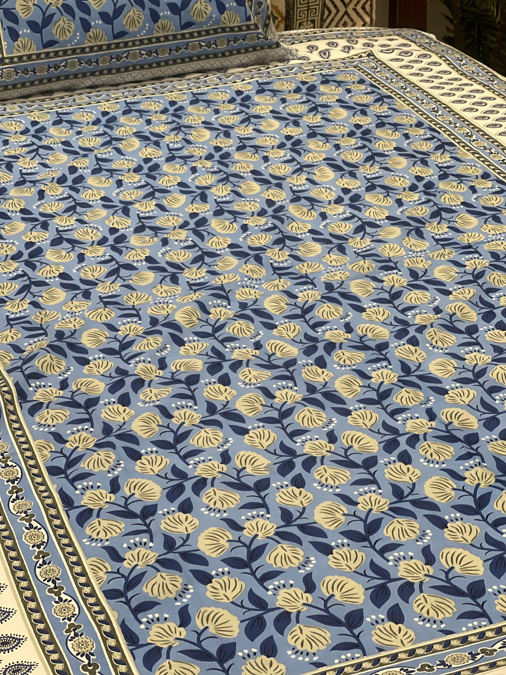 Crafted from high-quality fabric, this bedsheet not only enchants with its visual allure but also ensures a comfortable and restful night's sleep. The thoughtfully designed blue floral prints add a touch of nature's grace to your bedroom, creating an atmosphere of calm sophistication.