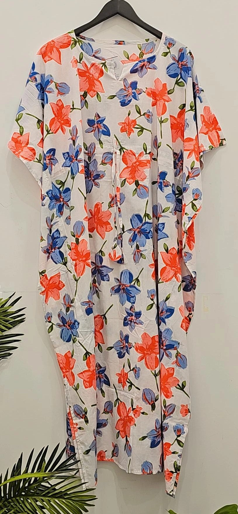 "Experience the epitome of comfort and style with our 'Orange and Blue Blossoms' kaftan collection. Crafted from pure cotton, these kaftans are perfect for sunny days, offering breathability and ease of movement. Whether you're lounging around or planning a quick shopping trip, these kaftans provide both comfort and style. Embrace the vibrant hues of orange and blue blossoms against a white backdrop, adding a touch of elegance to your wardrobe. Upgrade your relaxation and style game with our exclusive kaftan designs."