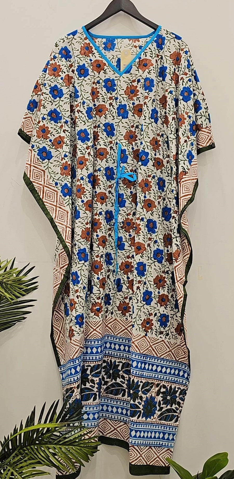 Introducing our "Azure Blossom: White Blue Floral Long Kaftans" – the epitome of comfort and style for your summer wardrobe. Crafted for ultimate relaxation, whether you're lounging at home or running quick errands, these kaftans offer unparalleled comfort and ease. Their breathable fabric and comfy design make them perfect for lazing around or throwing over for spontaneous outings during the warm summer months. Embrace effortless comfort and stay cool in style with our Azure Blossom Long Kaftans.