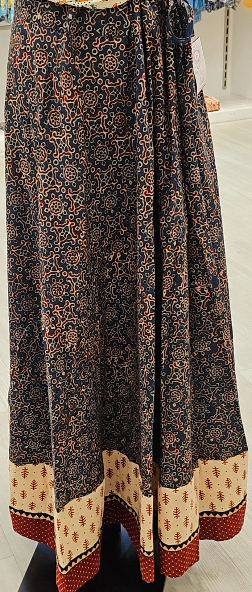 "Indulge in the allure of our Blue Ajrakh Handblock Print Skirts. These long flared skirts boast exquisite handblock print borders that add a touch of charm to your ensemble. Crafted for comfort, they are perfect for pairing with a halter top or a plain t-shirt, ensuring a stylish and relaxed look. Whether it's a dinner date or a casual outing, these skirts are versatile and effortlessly elegant."
