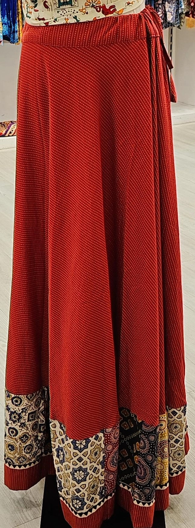 "Step out in style with our Maroon Majesty Kantha Embroidered Long Skirt. Crafted to perfection, these long flared skirts exude elegance and charm. Whether it's a romantic dinner date or a casual outing with friends, this versatile piece will elevate your look effortlessly. Made from pure cotton and adorned with intricate handblock print borders, these skirts blend comfort with traditional craftsmanship for a truly remarkable attire.