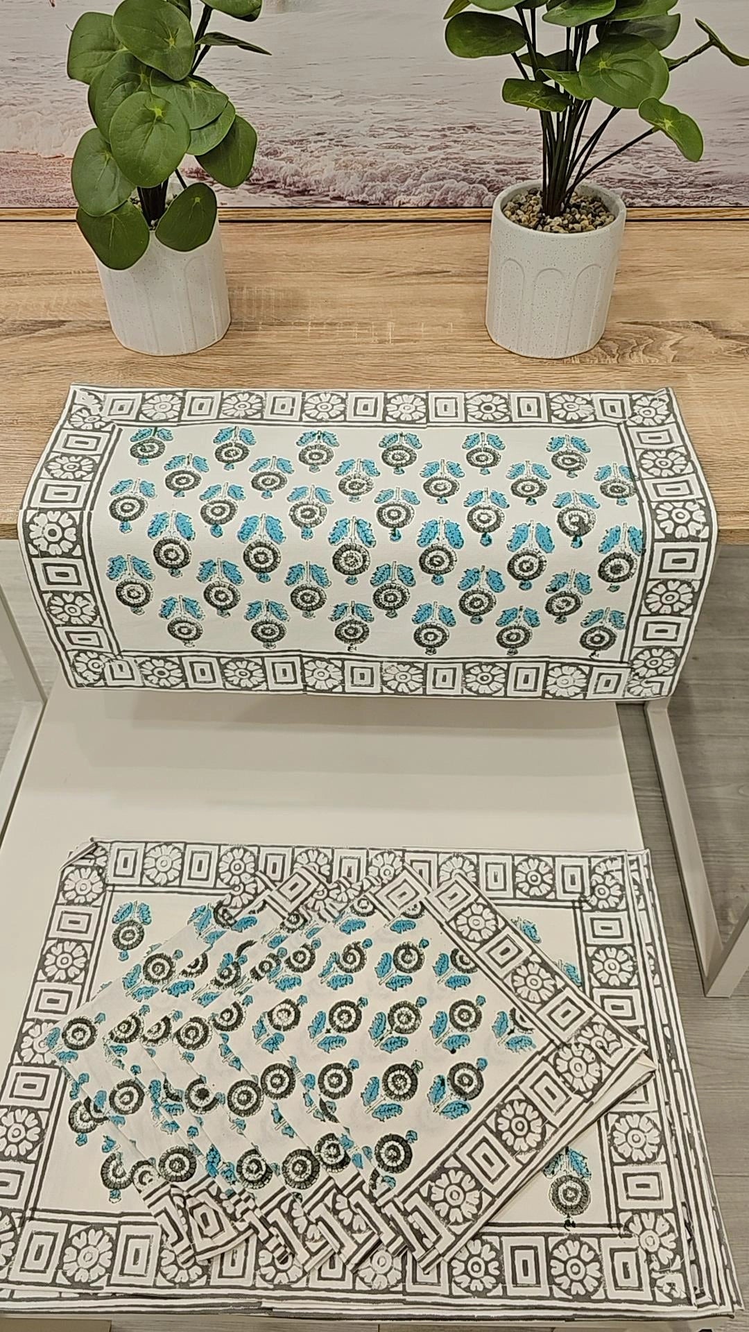 Crafted from 100% cotton, this dining set not only provides a gentle and luxurious feel but also ensures durability for everyday use. The handblock printing technique used in their creation adds an artisanal touch, making each placemat and serviette a unique expression of craftsmanship and attention to detail.