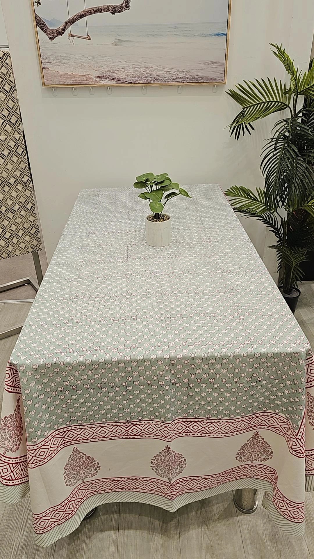 Immerse your dining space in the artistry of hand block printing with our "Tranquil Lotus Greens: Green Tablecloth with Small Lotus Motifs." Each piece is a testament to meticulous craftsmanship, featuring delicate lotus motifs meticulously hand block printed onto a soothing green canvas.
