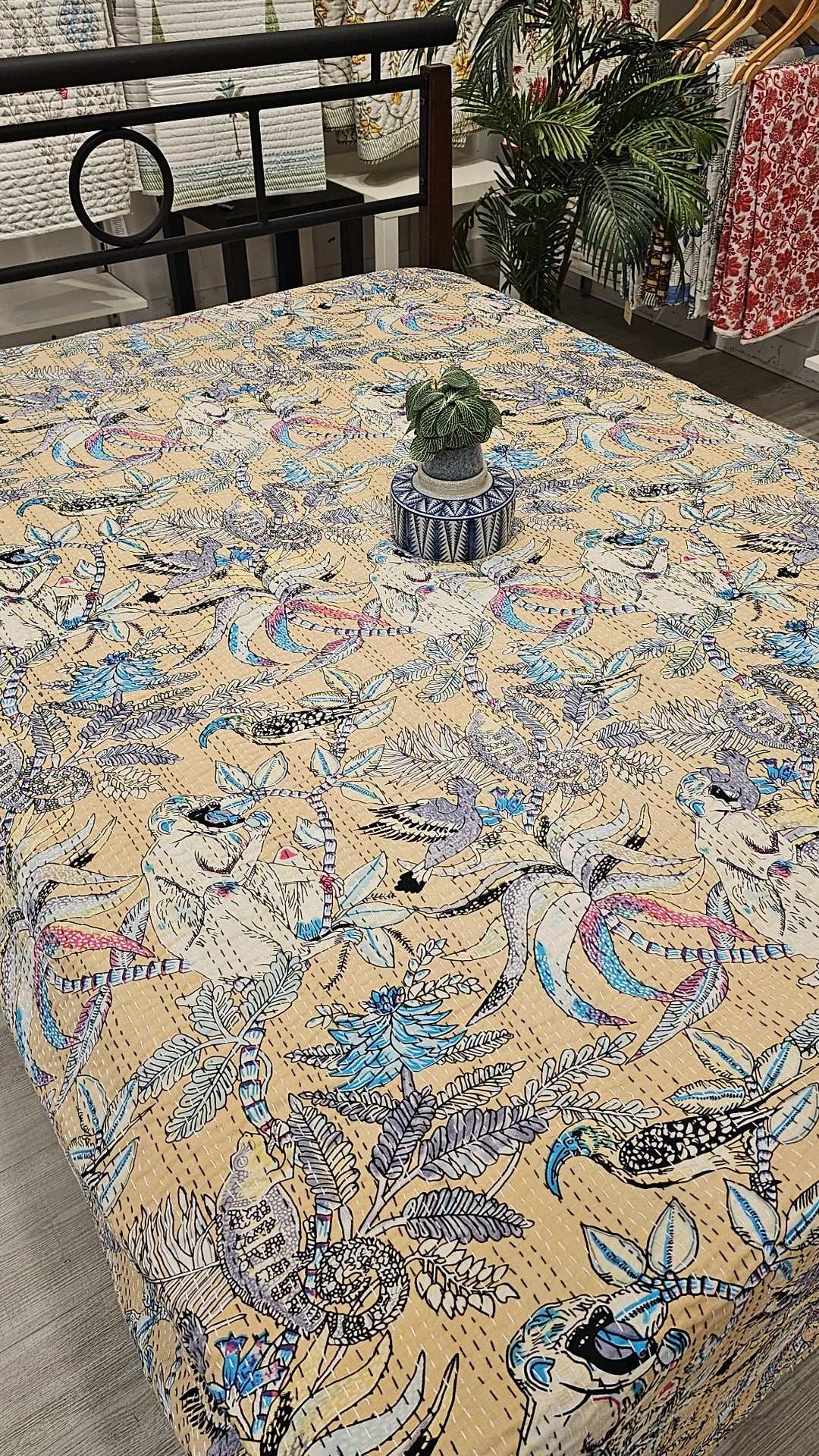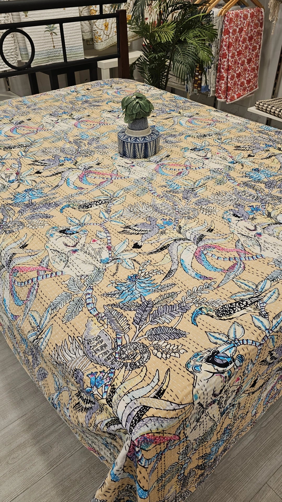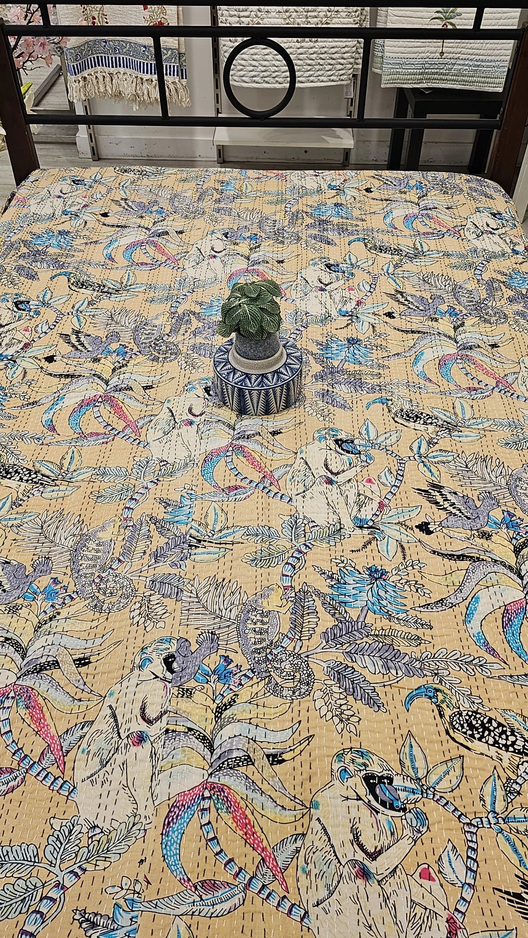 Introducing our "Jungle Serenade" Kantha Quilt, where whimsical charm meets untamed beauty. Immerse yourself in a lively tapestry of playful monkeys and vibrant birds, meticulously hand-stitched by skilled artisans using the traditional Kantha technique.