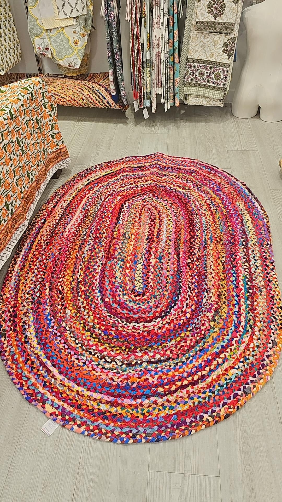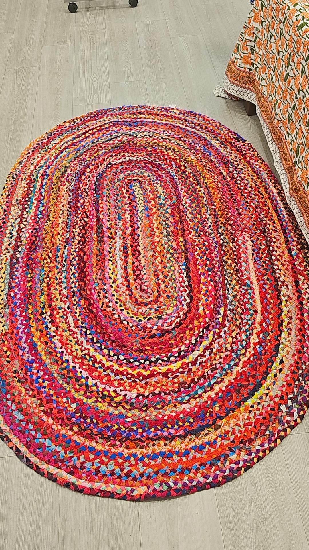 Elevate your living room or outdoor space with our handmade multicolored oval rug, crafted from high-quality fabrics. This exquisite rug combines artistry and sustainability, offering a vibrant and stylish addition to any setting.