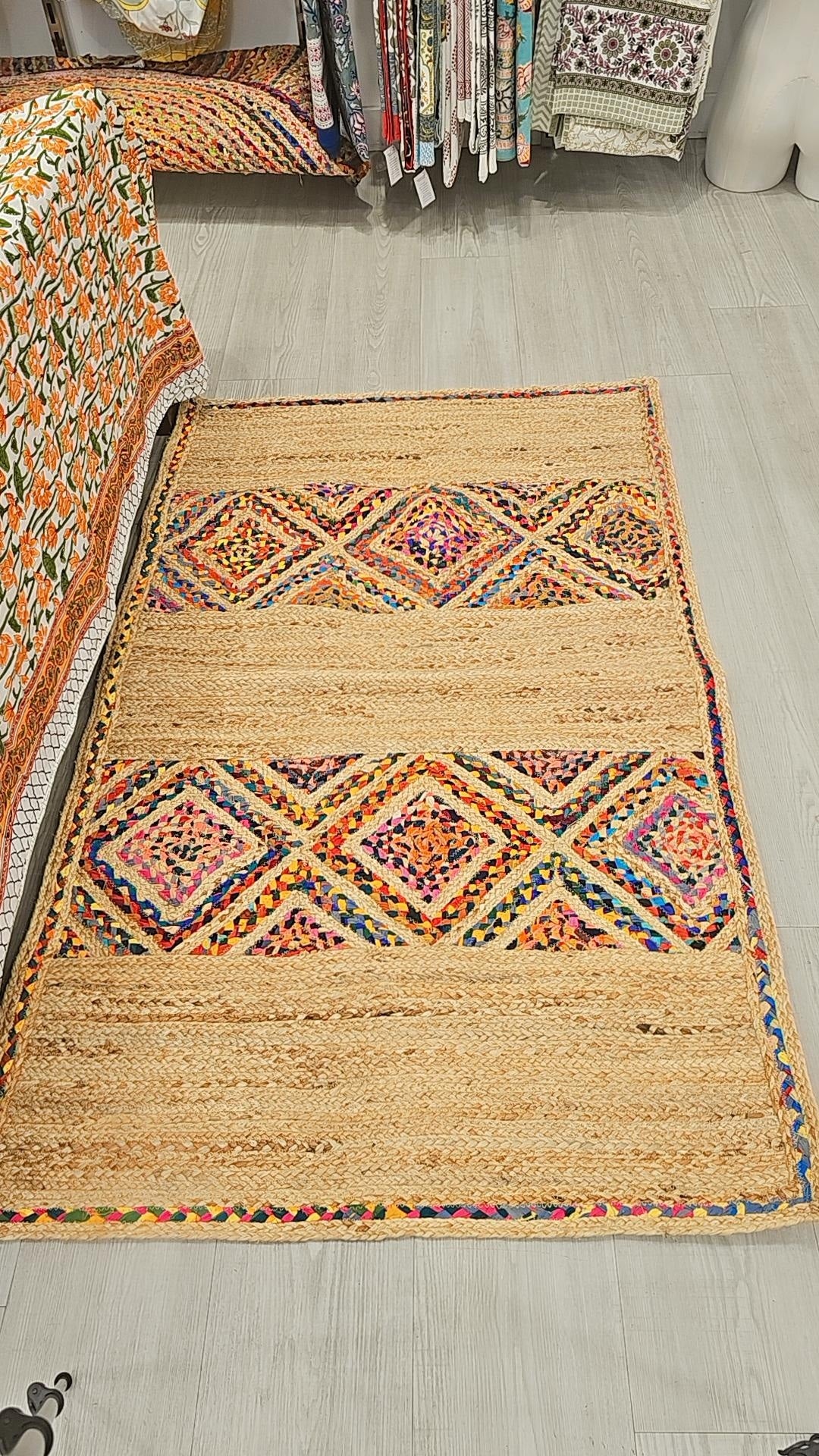 Handcrafted from premium, eco-friendly jute fibers, this rug is both durable and sustainable, reflecting a commitment to quality and environmental responsibility. The natural texture of jute brings a warm, earthy feel to your space, while the vibrant multicolored patterns create a dynamic and inviting atmosphere.