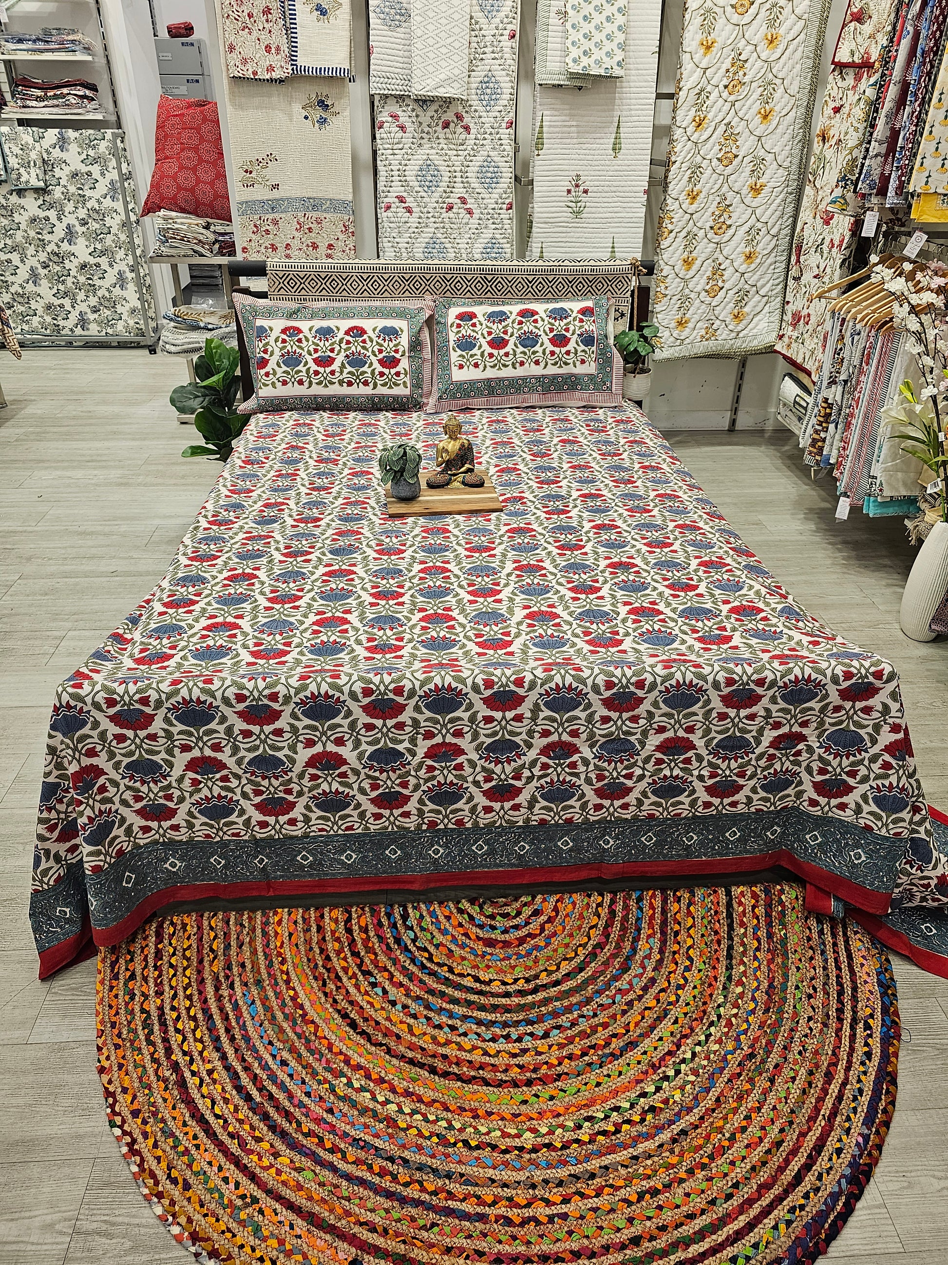 Immerse yourself in a sea of elegance with our "Crimson Waves" Red and Blue Motif Dream Bedsheet. This exquisite bedding ensemble is a visual delight, blending the richness of crimson with the calming allure of blue motifs.
