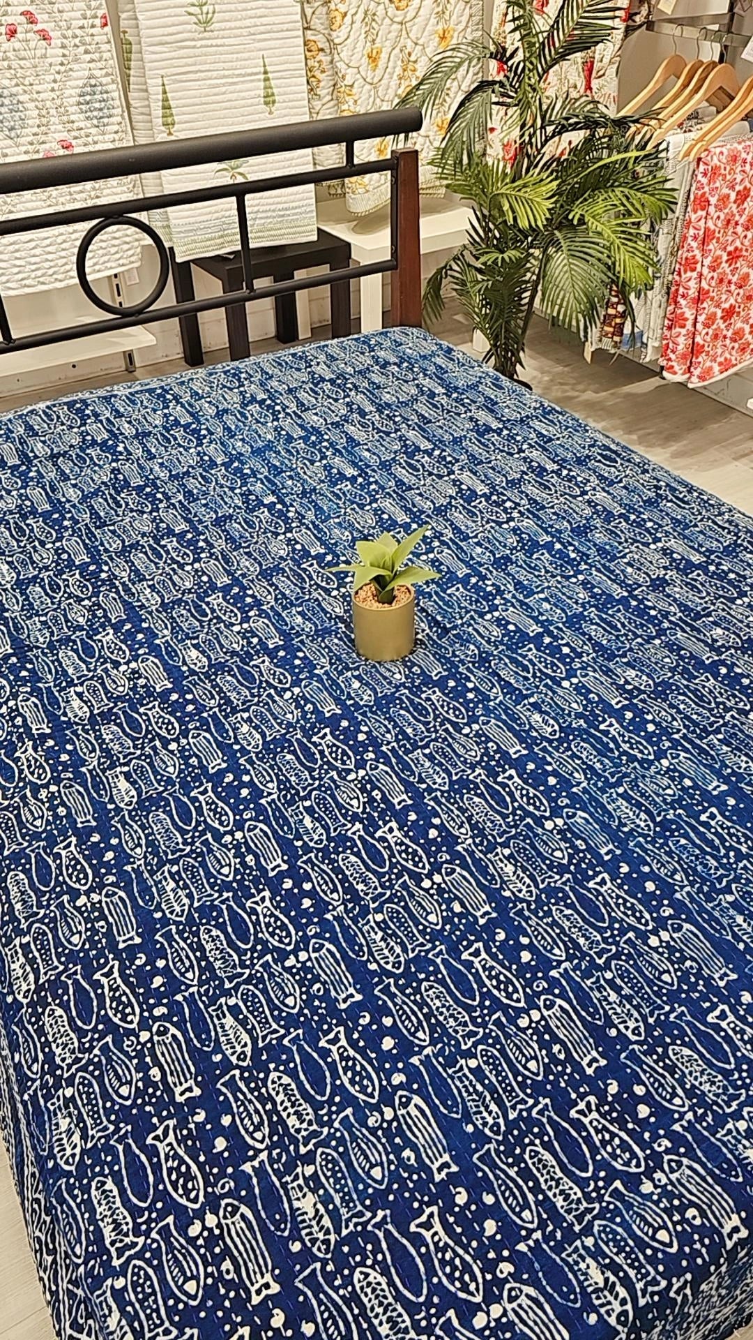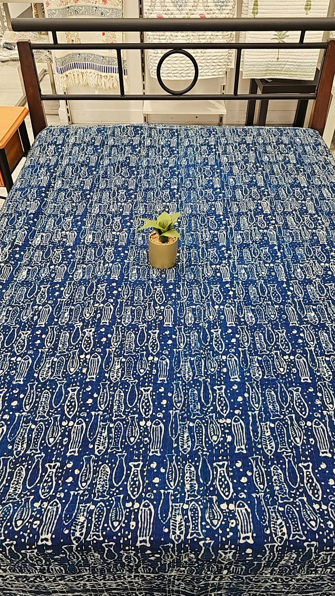 Dive into the serene depths of style and comfort with our "Ocean Symphony: Indigo Fish Tales Kantha Quilt." Immerse yourself in a sea of indigo, adorned with whimsical fish prints, each telling its unique aquatic story. Meticulously hand-stitched using the traditional Kantha technique, this quilt is a testament to the artistry and craftsmanship of our skilled artisans.