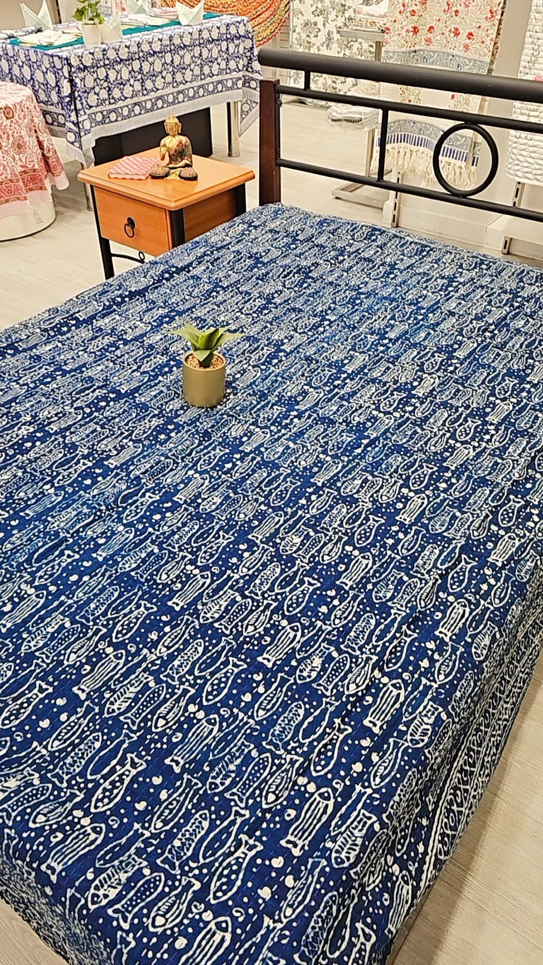 Crafted from high-quality cotton, the quilt not only promises a soft and luxurious feel but also ensures durability for years to come. The rhythmic dance of fish motifs against the indigo backdrop creates a symphony of oceanic elegance.