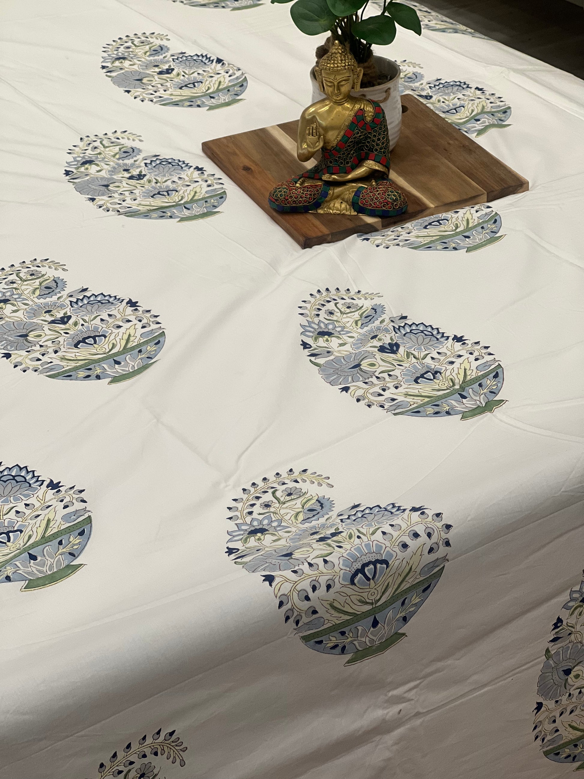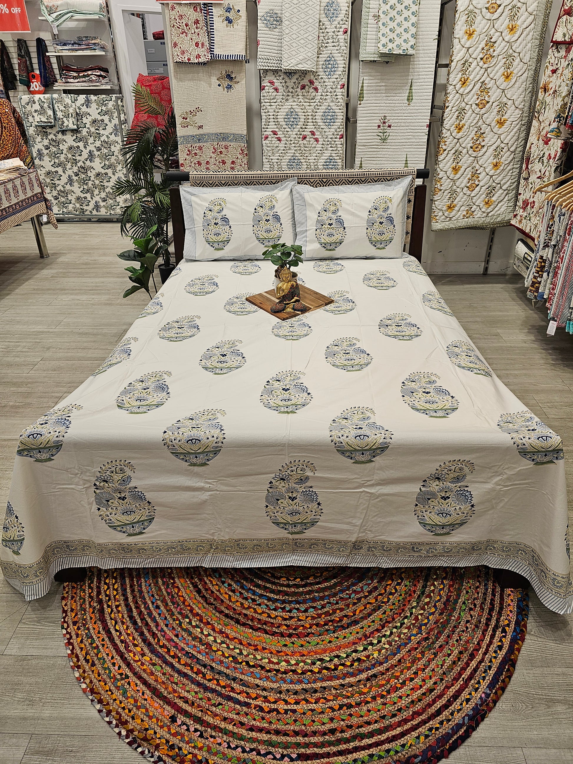 "Timeless Elegance: White Paisley Dreams Handblock Printed Bedsheet"