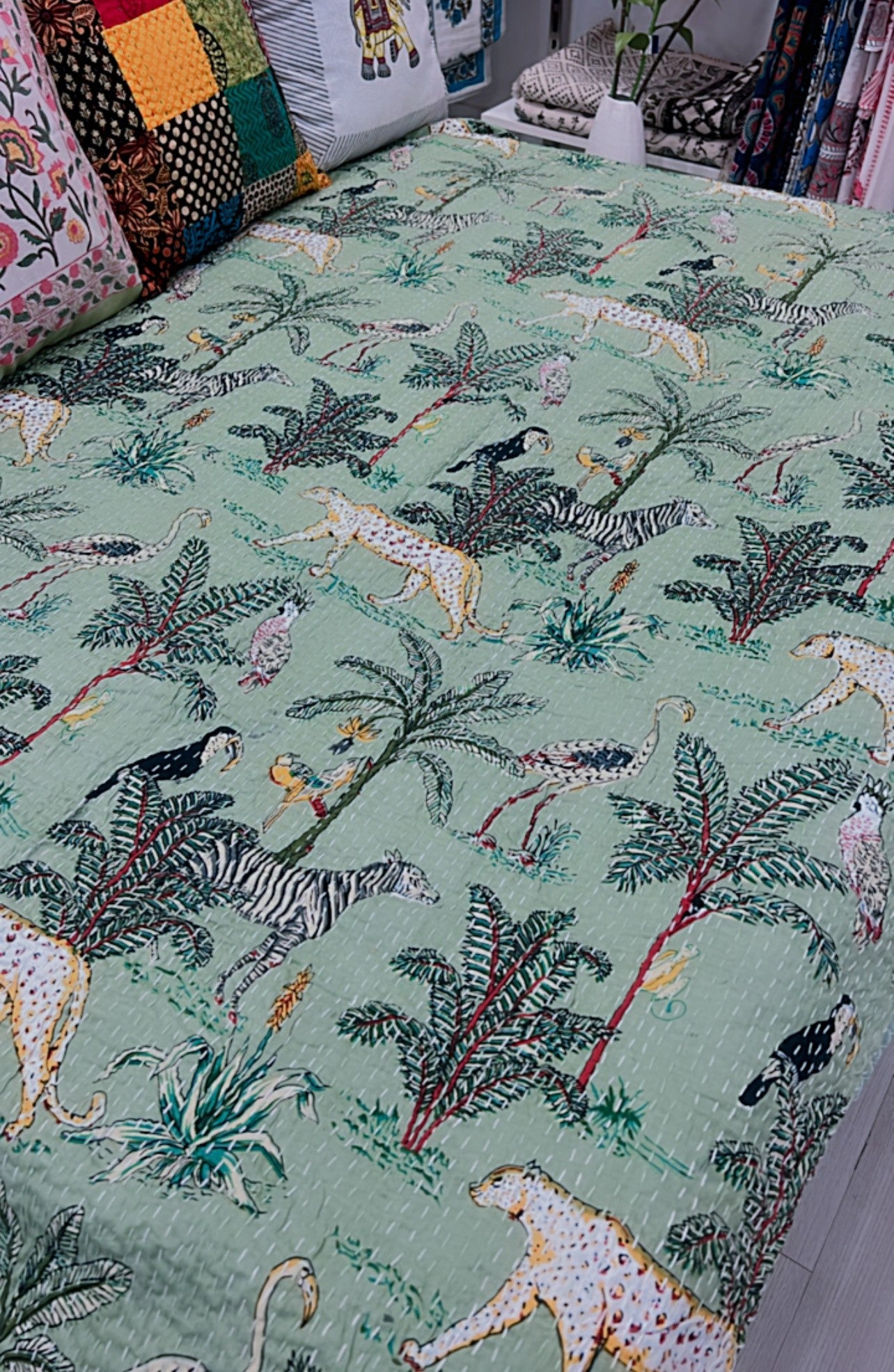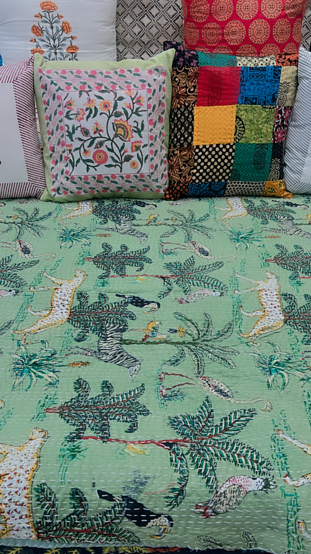Indulge in the exquisite comfort and timeless elegance of pure cotton handmade kantha quilts, adorned with captivating jungle prints on one side and a soothing plain color on the other. These meticulously crafted quilts offer not only warmth and coziness but also a touch of natural beauty to your bed or lounge.
