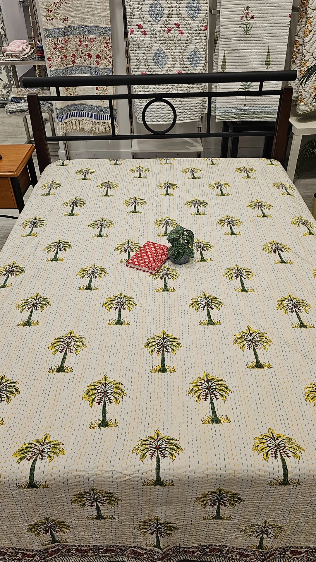 Introducing our "Ivory Oasis: Green Palms Kantha Quilt" — a tranquil escape into the heart of nature's serenity. Immerse yourself in the soothing blend of off-white and green hues adorned with graceful palm trees, meticulously hand-stitched by skilled artisans using the traditional Kantha technique.