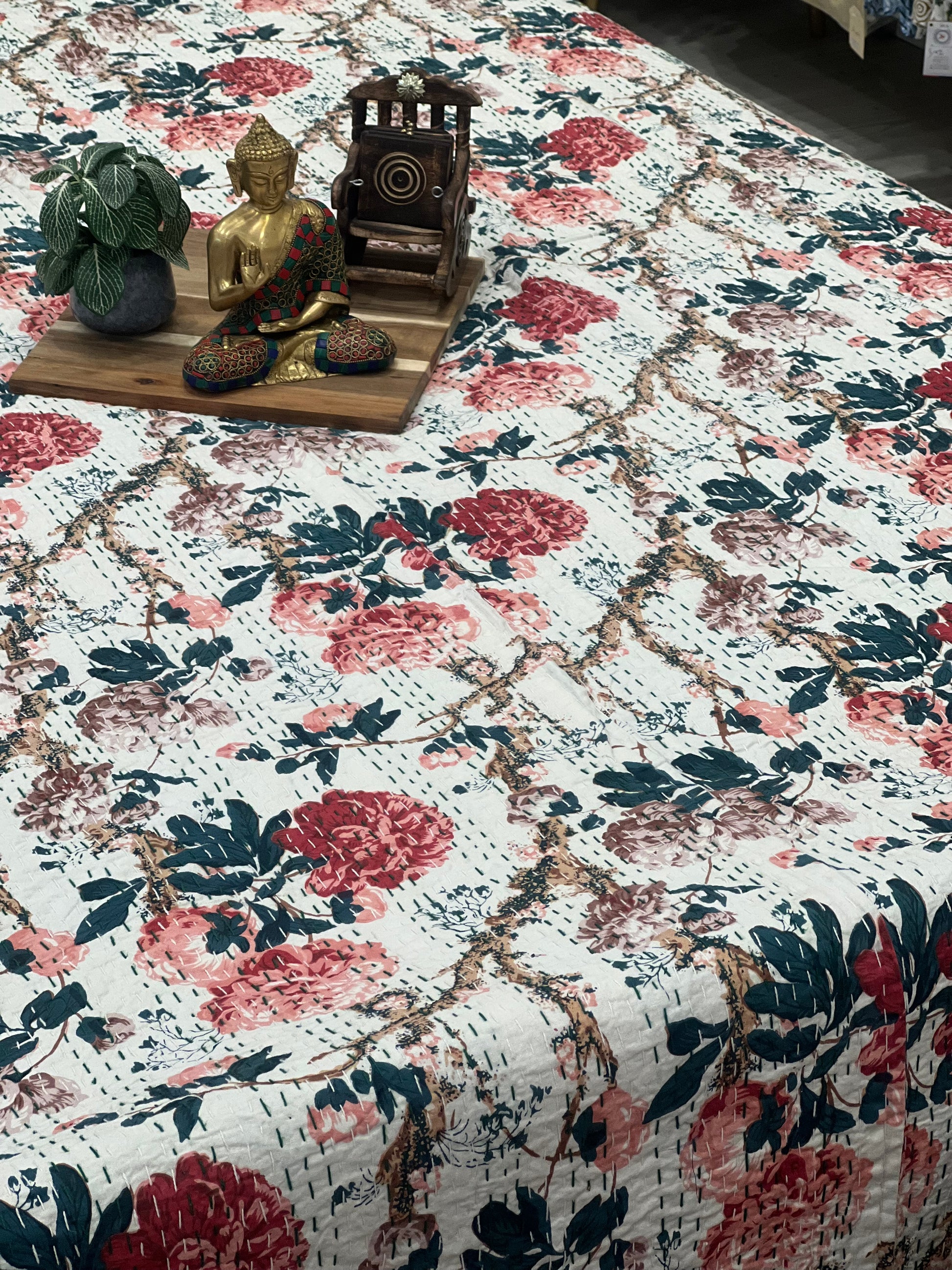 Introducing our Red Rose Kantha Quilt – a timeless expression of romance and elegance. Immerse yourself in the deep, passionate reds of this exquisite quilt adorned with intricate rose motifs, meticulously hand-stitched by skilled artisans using the traditional Kantha technique.