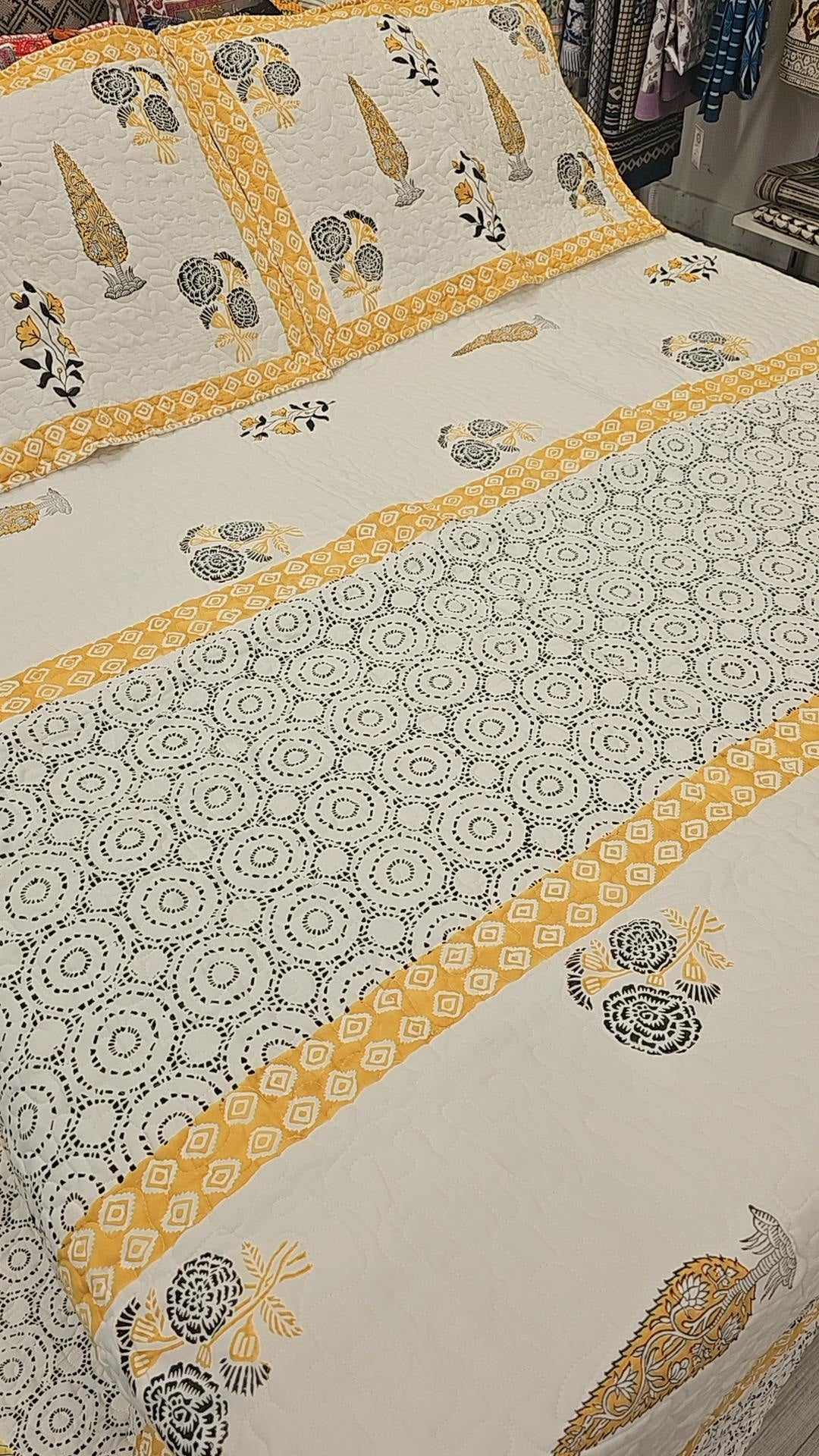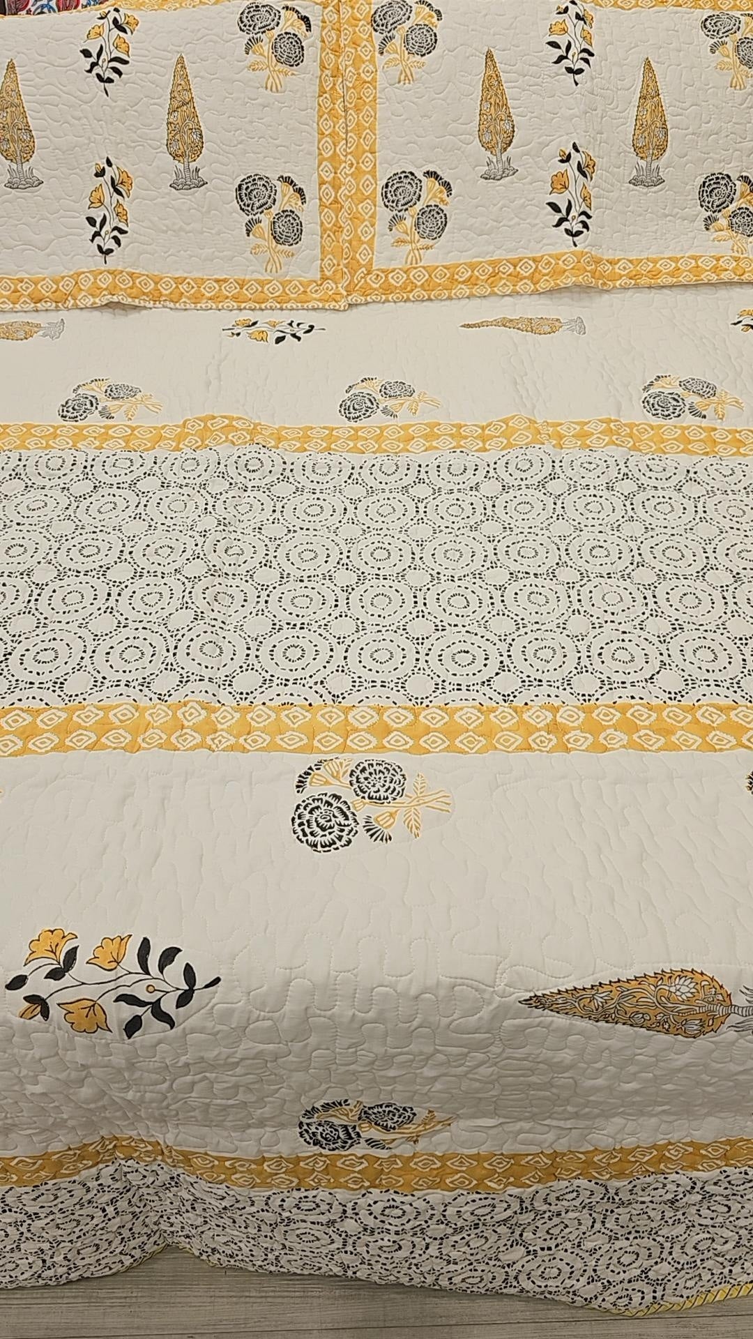 Introducing our "Sunrise Serenity: Off-White Mustard Comforter Set" - a stunning blend of comfort and style that will elevate your bedroom to new heights. Crafted with exquisite handblock print detailing, each piece in this set exudes warmth and sophistication.