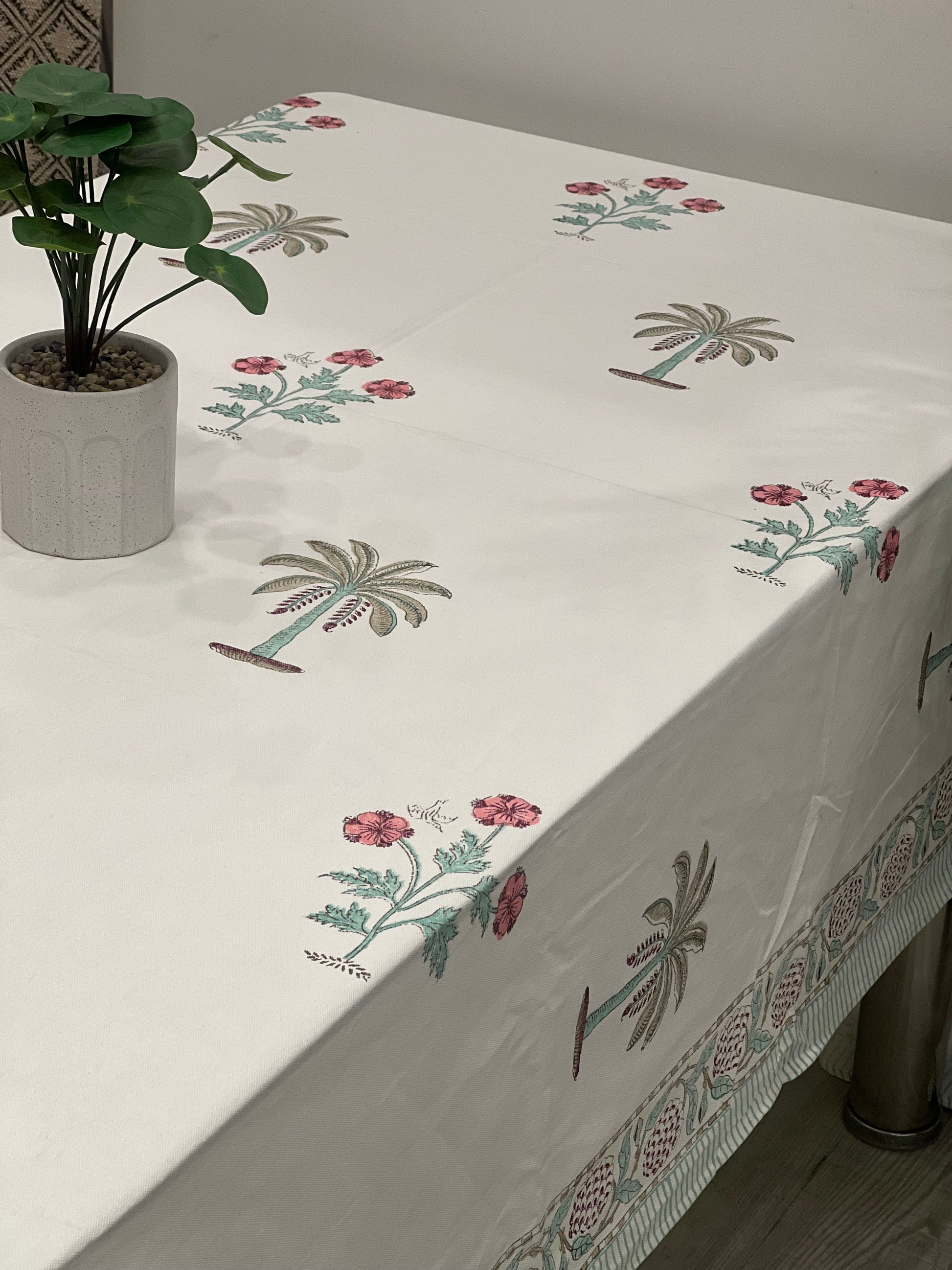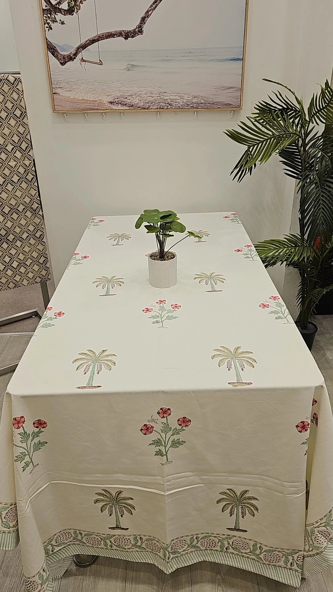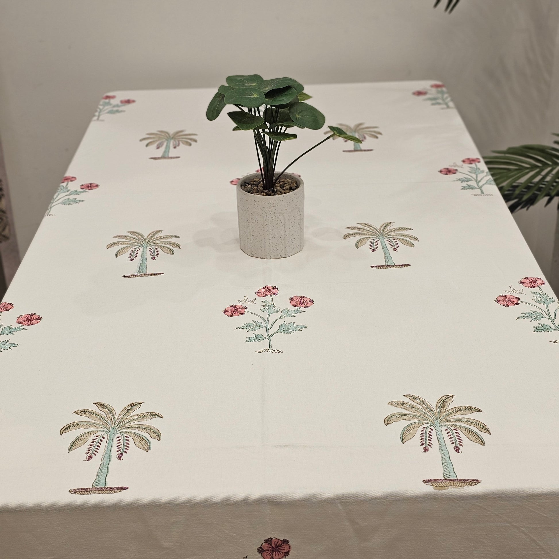 "Whispering Palms: Off-White Tablecloth with Pink Florals"