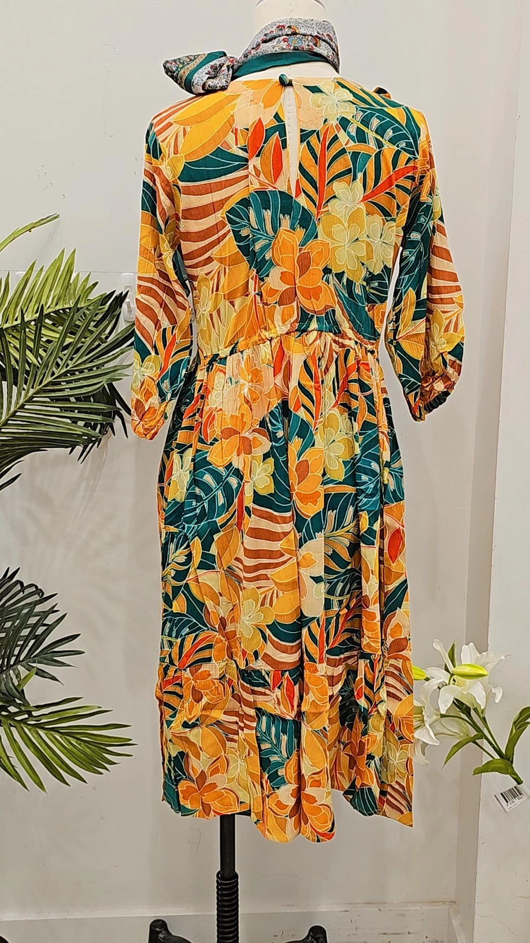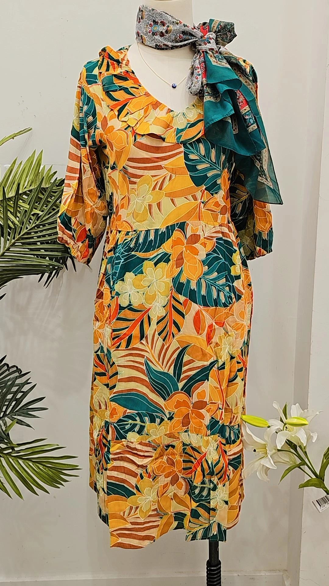 Transport yourself to a tropical paradise with this beautiful long sleeve dress. The lightweight fabric and flared skirt are perfect for summer, while the V neckline and ruffle detail add a touch of elegance. The tropical print is sure to turn heads wherever you go. Whether you're on vacation or just enjoying a summer day at home, this dress is the perfect way to add a touch of island flair to your outfit.