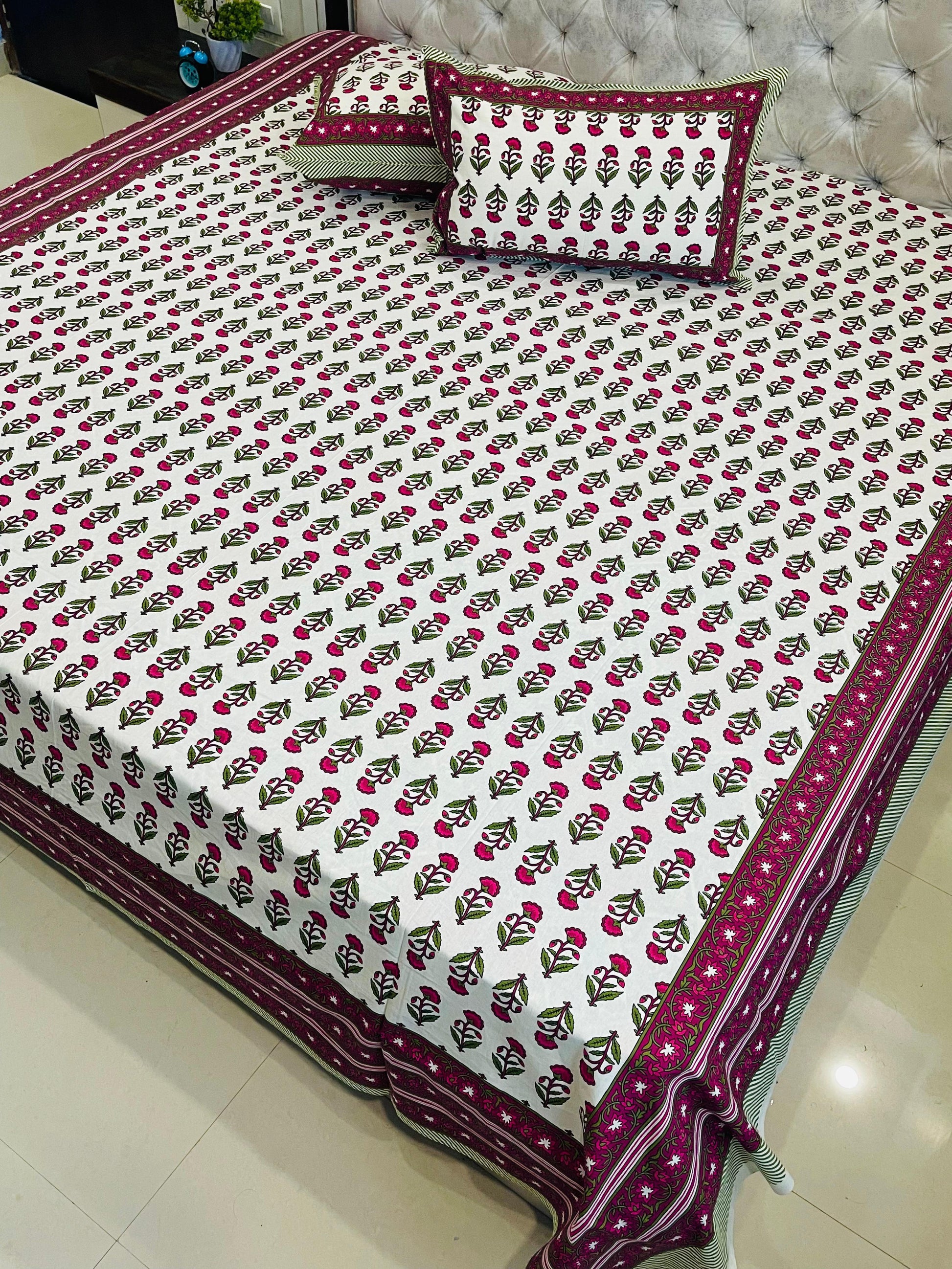 What makes these bedsheets truly special is the intricate handblock print work. Designed and created by skilled artisans, each print carries the beauty of traditional craftsmanship. Every piece is unique, adding a touch of elegance, warmth, and individuality to your bedroom décor.