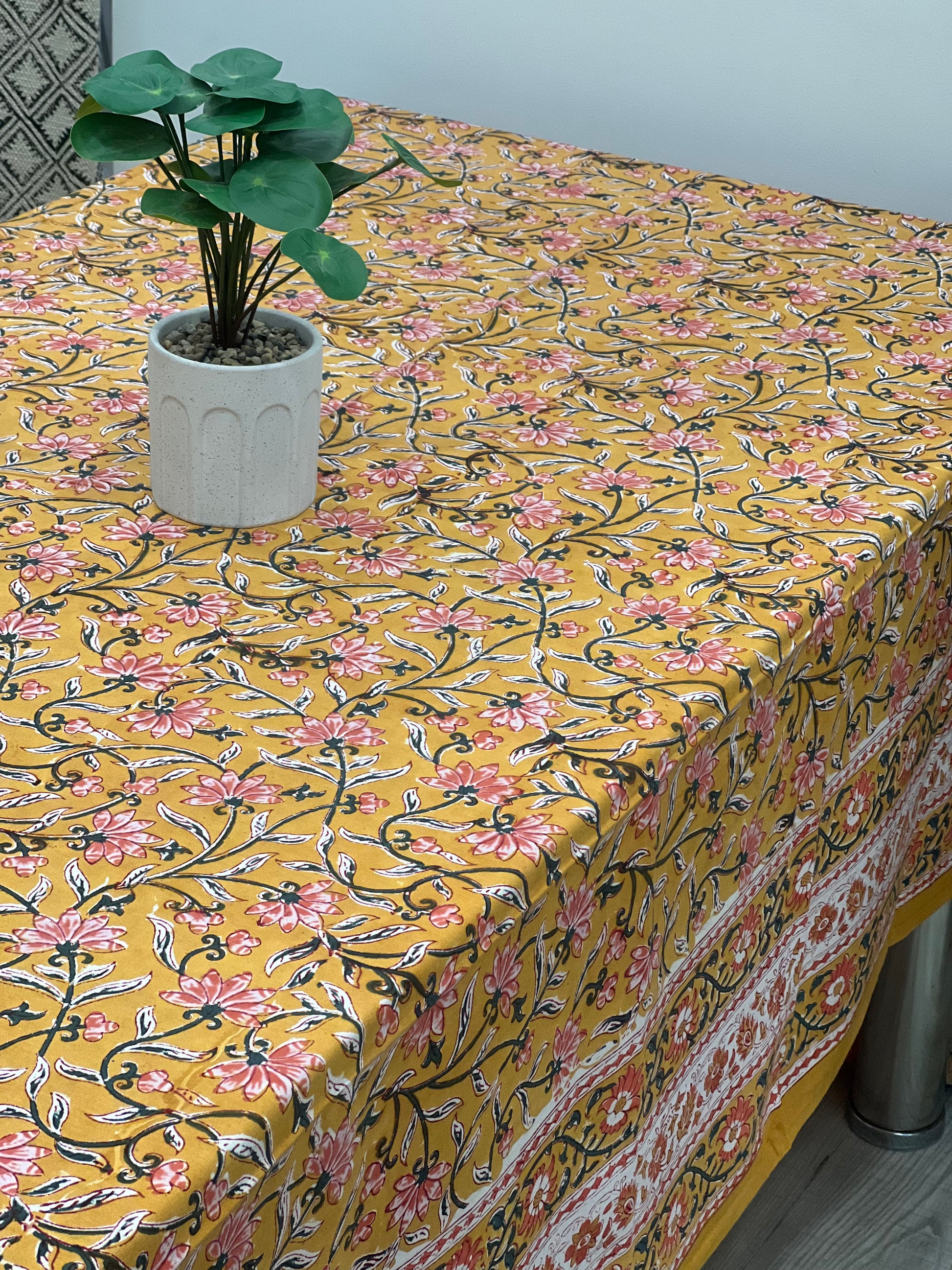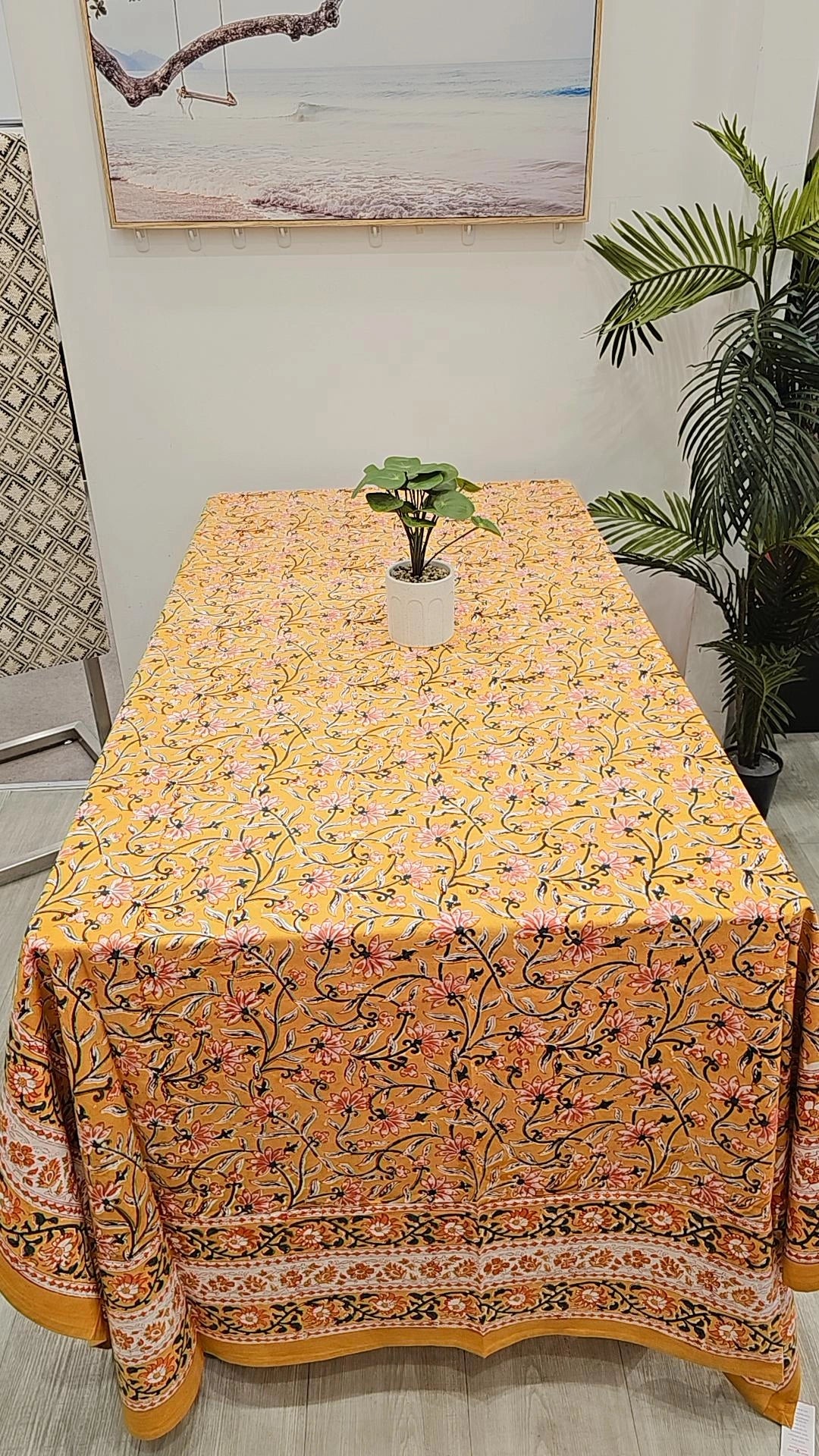 Elevate your dining space with the radiant charm of "Sun-Kissed Petals." Let every meal be a celebration of color and style, as the yellow and pink florals dance across the tablecloth, bringing a touch of joy and elegance to your cherished moments.